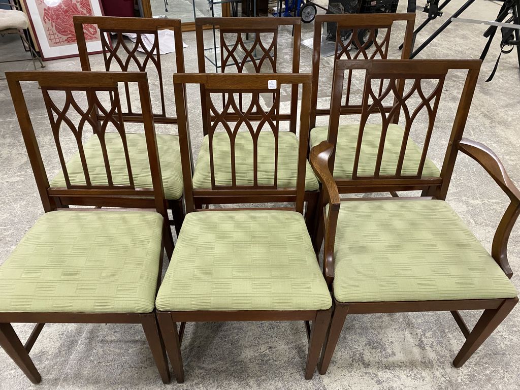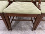 Six Federal Style Dining Chair, five sides, one arm, clean cushions, mahogany, inlaid trim. Six Federal Style Dining Chair, five sides, one arm, clean cushions, mahogany, inlaid trim.