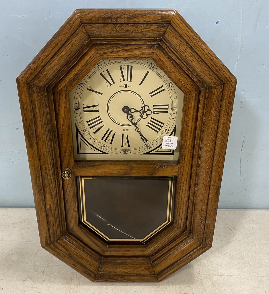 Howard Miller Battery Operated Wall Clock, oak case, pendulum, good condition, 21"h., 13"w. Howard Miller Battery Operated Wall Clock, oak case, pendulum, good condition, 21"h., 13"w.