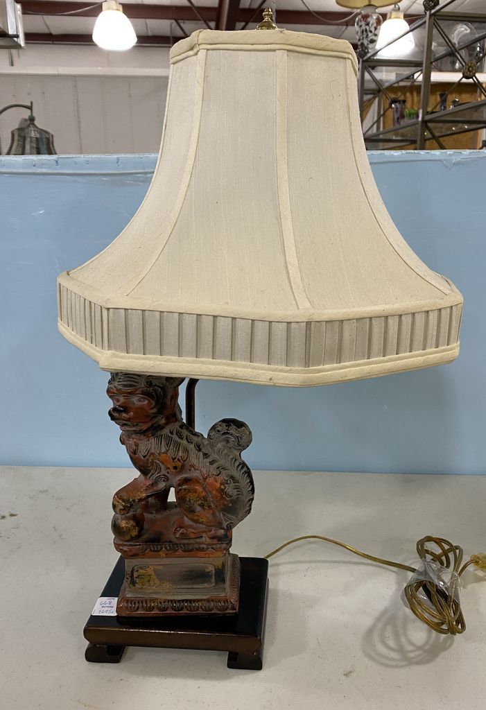 Metal Foo Dog Statue Lamp, wood base, with shade, 22"h. Metal Foo Dog Statue Lamp, wood base, with shade, 22"h.