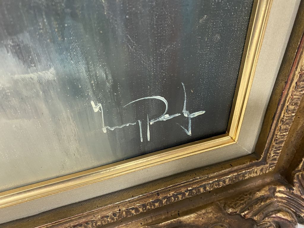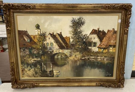 Reproduction of Eric Paulson Painting of Village, on canvas, framed, 31"h., 43"w. Reproduction of Eric Paulson Painting of Village, on canvas, framed, 31"h., 43"w.