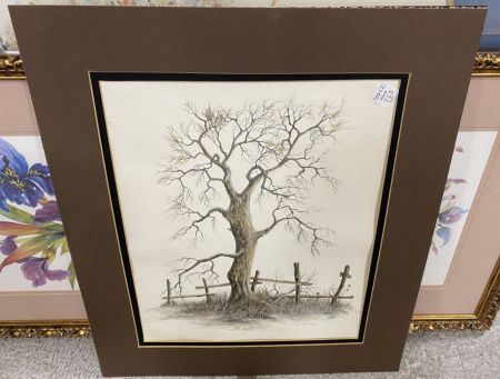 Print of Leafless Tree with Branches and Broken Fence by Eliff. 22" h. 19" w. Print of Leafless Tree with Branches and Broken Fence by Eliff. 22" h. 19" w.