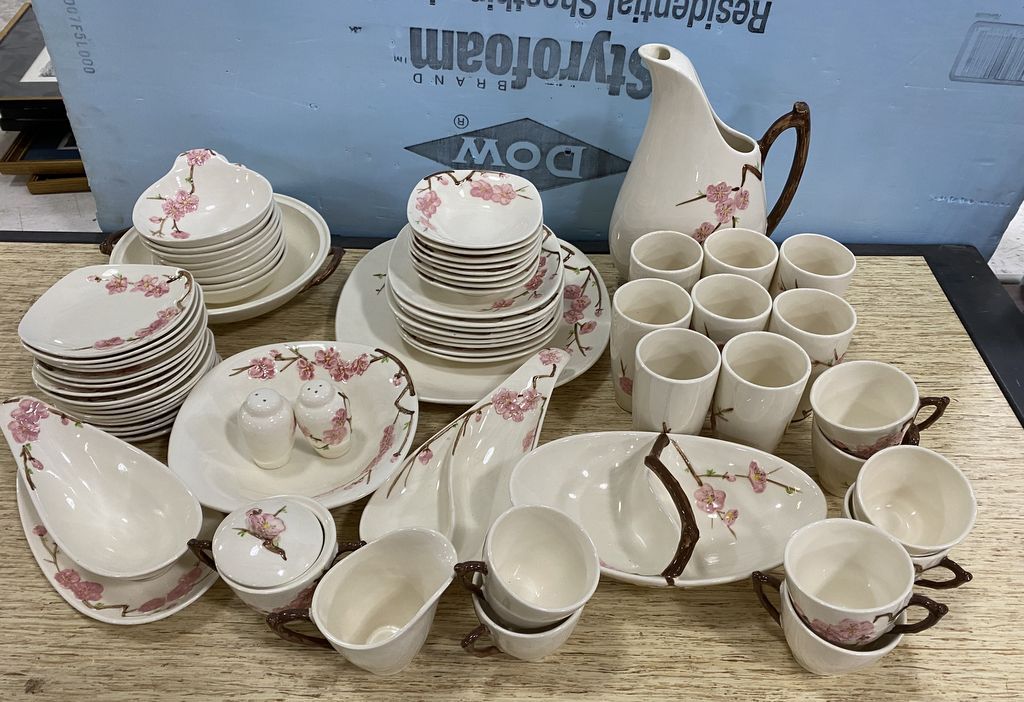 Pobby Trail "Peach Blossom" China. Gravy, 8 soup bowls, water pitcher and cup set, 16 desert plates, salt and pepper, platter, 8 berry bowls, serving bowl, 8 salad plates, creamer and sugar Pobby Trail "Peach Blossom" China. Gravy, 8 soup bowls, water pitcher and cup set, 16 desert plates, salt and pepper, platter, 8 berry bowls, serving bowl, 8 salad plates, creamer and sugar