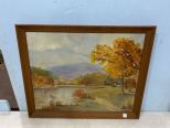 Framed Oil Painting of Landscape With Lake Signed by Mabel Hoeott 1958. 25" h. 31" w. Framed Oil Painting of Landscape With Lake Signed by Mabel Hoeott 1958. 25" h. 31" w.