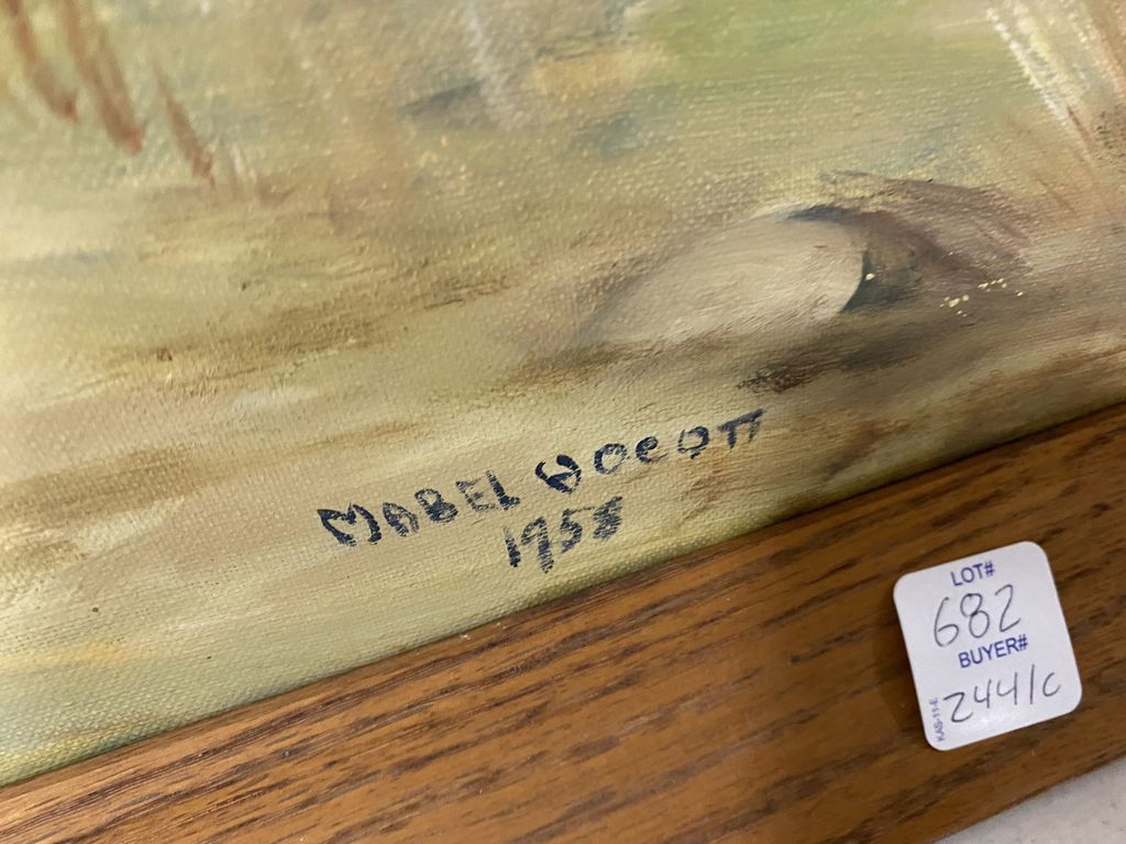 682 Framed Oil Painting of Landscape With Lake Signed by Mabel Hoeott 1958