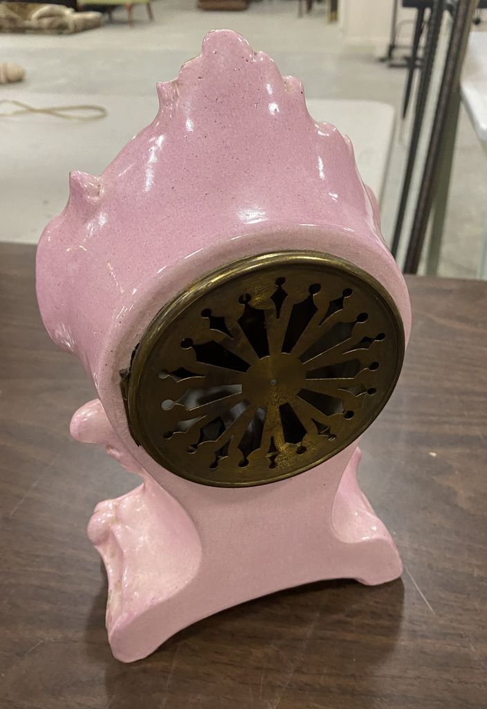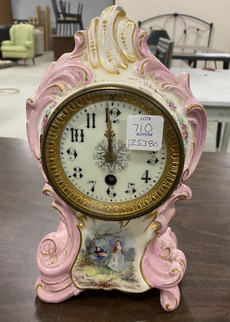 Antique Porcelain Hand Painted Mantle Clock. Imagine of Lady and Gent. Gold Gilt Trim. Has key and pendulum. Good condition. Antique Porcelain Hand Painted Mantle Clock. Imagine of Lady and Gent. Gold Gilt Trim. Has key and pendulum. Good condition.