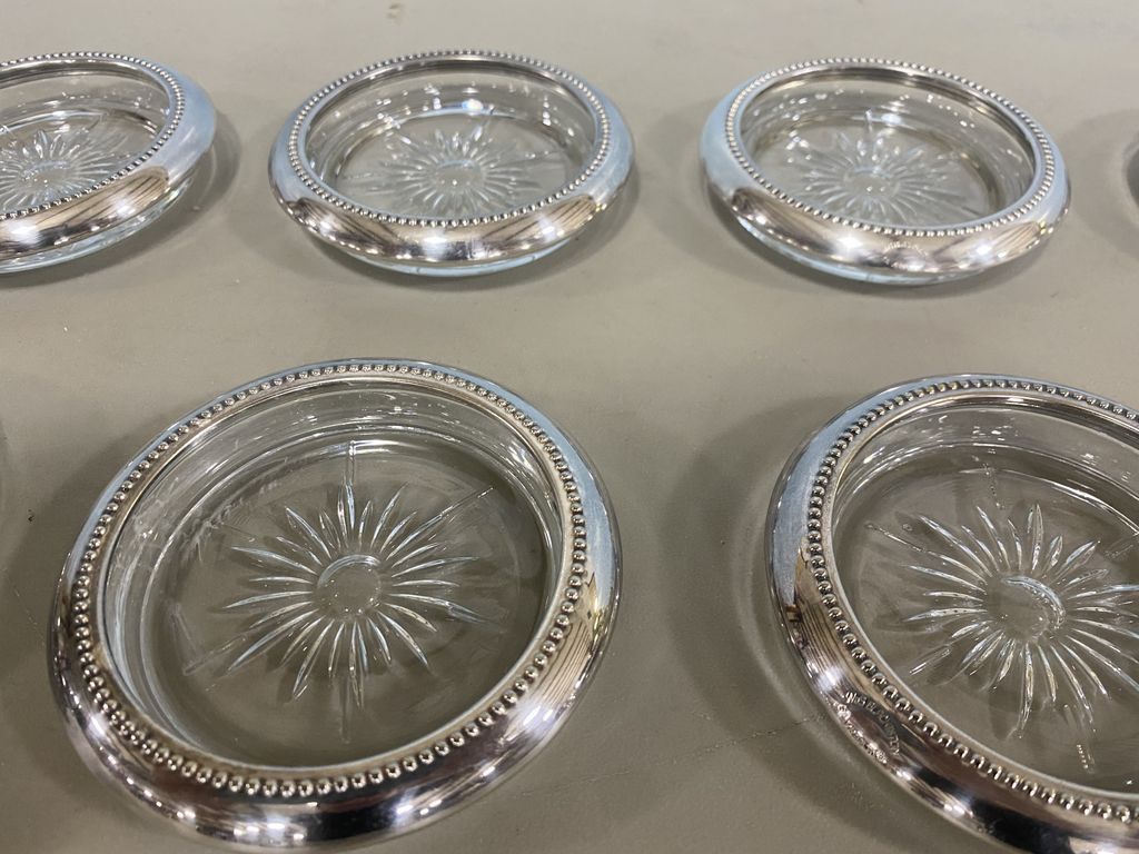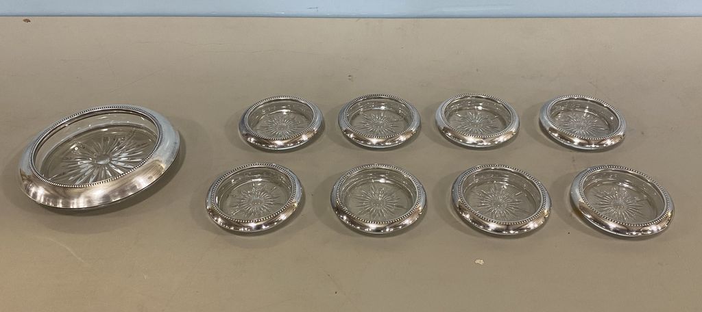 Set of Sterling Rimmed Coasters and Ashtray. Total of 8 coasters. Set of Sterling Rimmed Coasters and Ashtray. Total of 8 coasters.
