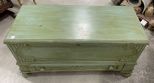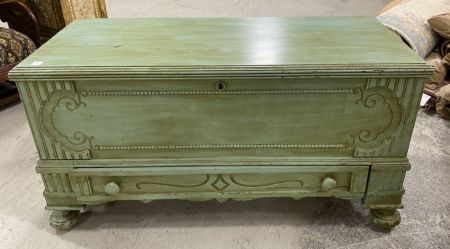 Roos Cedar Chest, Sealittle LTD, depression era design, painted distressed, needs some trim re glued, 23"h., 44"w., 18"d. Roos Cedar Chest, Sealittle LTD, depression era design, painted distressed, needs some trim re glued, 23"h., 44"w., 18"d.