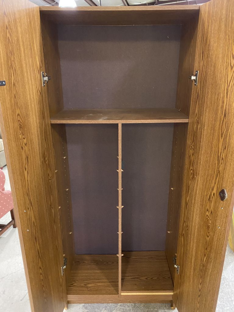 Pressed Wood Oak Finish Storage Cabinet, double door, has some shelves, 72"h., 30"w., 15"d. Pressed Wood Oak Finish Storage Cabinet, double door, has some shelves, 72"h., 30"w., 15"d.