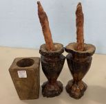 Pair of wood carved candle holder, 7"h., and primitive style wood candle holder. Pair of wood carved candle holder, 7"h., and primitive style wood candle holder.