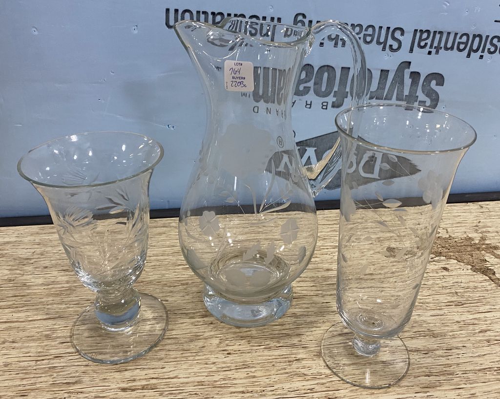 Three Piece Etched Glass Pieces, two vases, and water pitcher 13"h. Three Piece Etched Glass Pieces, two vases, and water pitcher 13"h.