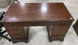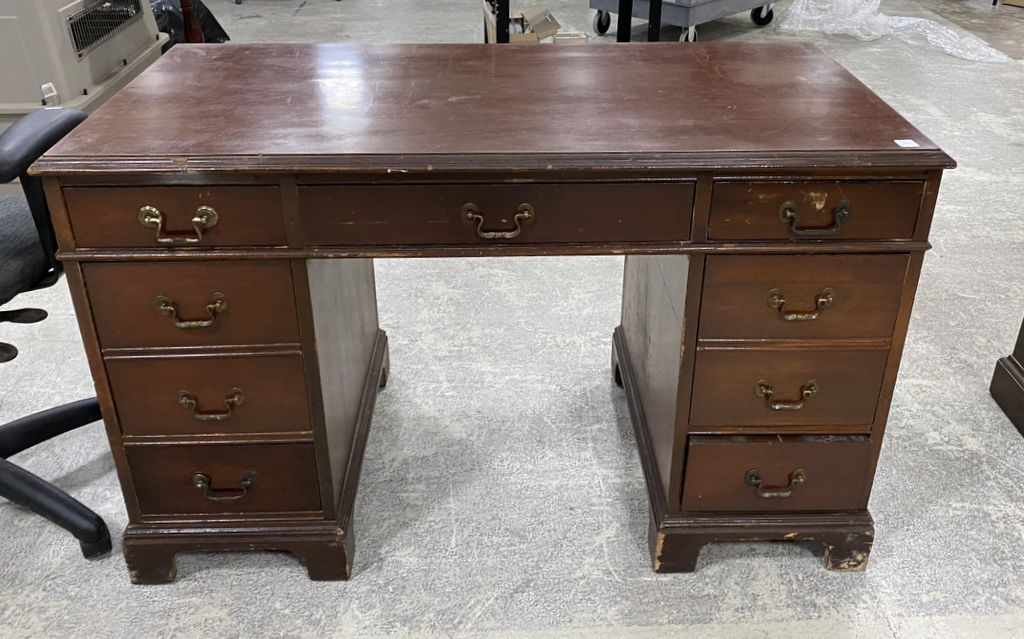 Kneehole writing desk, modern, cherry, 7 drawers, has scratches and wear, 29"h., 48"w., 24"d. Kneehole writing desk, modern, cherry, 7 drawers, has scratches and wear, 29"h., 48"w., 24"d.