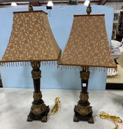 Pair of Candle Stick Style Lamps, with shades, good condition, 34"h. Pair of Candle Stick Style Lamps, with shades, good condition, 34"h.