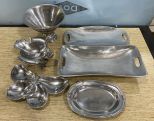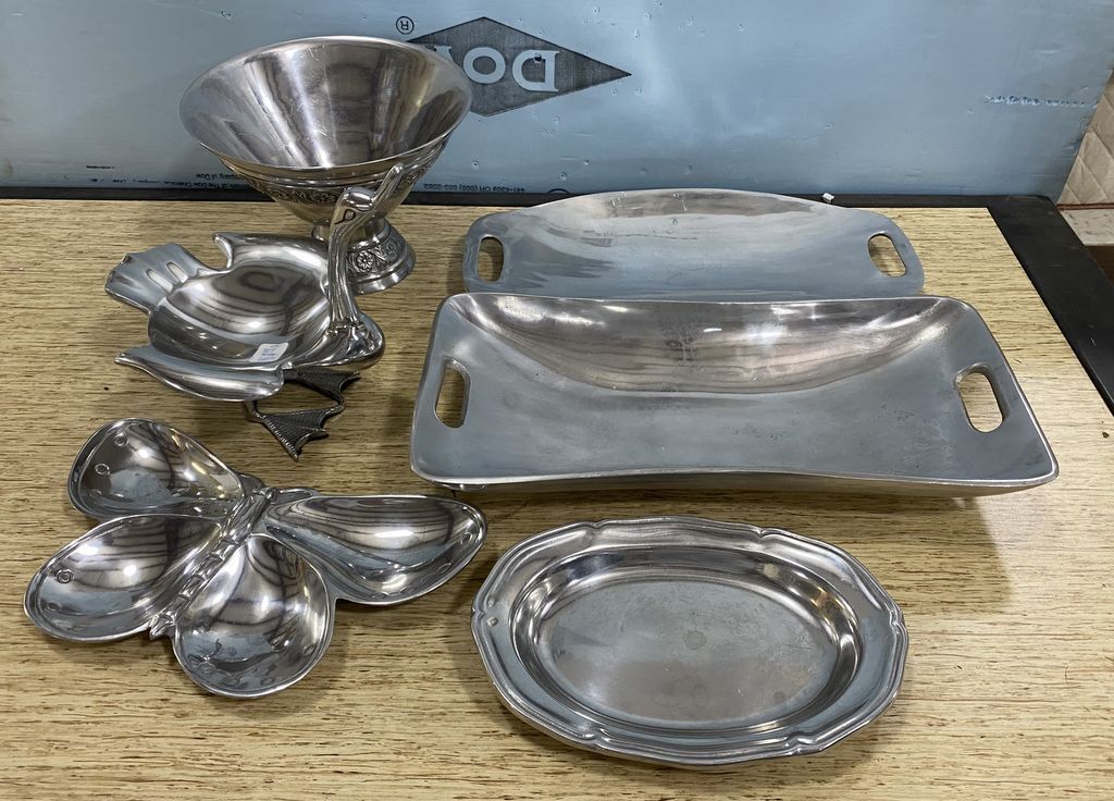 Six Piece Metal Serving Ware and Decor, trays, compote, bird dish, butterfly dish, oval dish. Six Piece Metal Serving Ware and Decor, trays, compote, bird dish, butterfly dish, oval dish.
