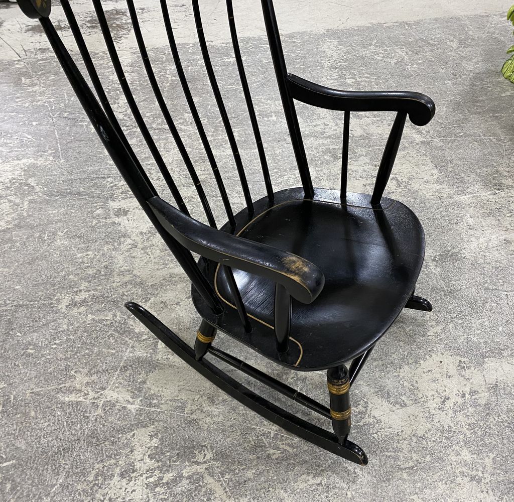 Nichols and Sons Hitchcock Style Rocker. Has wear, painted black. 40" h. Nichols and Sons Hitchcock Style Rocker. Has wear, painted black. 40" h.