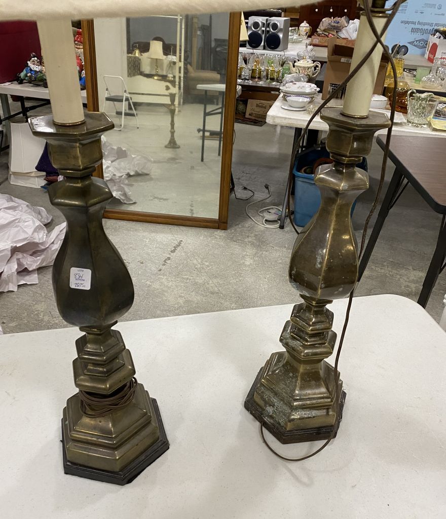 Pair of Brass Candle Stick Lamps, vintage, one missing shade, 40"h. Pair of Brass Candle Stick Lamps, vintage, one missing shade, 40"h.
