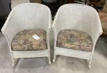 Pair of White Painted Wicker Sunroom Chairs, rockers, aged condition, cushions. Pair of White Painted Wicker Sunroom Chairs, rockers, aged condition, cushions.