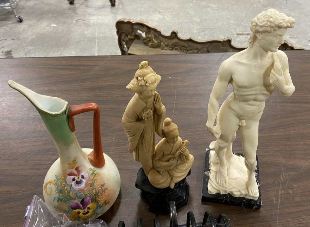 Resin Nude Statue, Resin Oriental Statue, Porcelain Ewer Vase, silver plate holder, wood mini goblets. Resin Nude Statue, Resin Oriental Statue, Porcelain Ewer Vase, silver plate holder, wood mini goblets.
