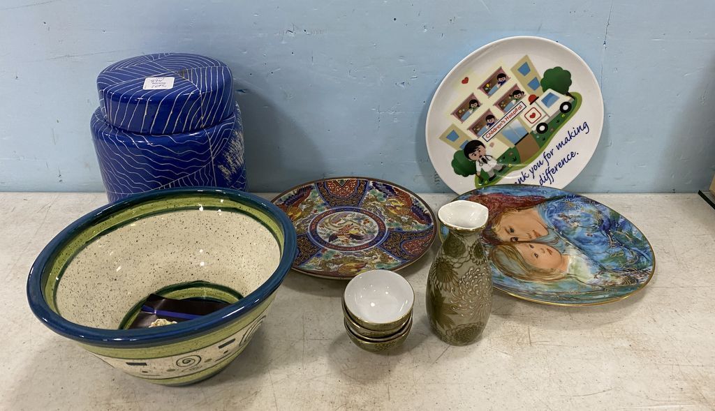 Group of Pottery Items, jar, bowl, imari plate, Edna Hibel plate. Group of Pottery Items, jar, bowl, imari plate, Edna Hibel plate.