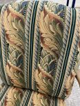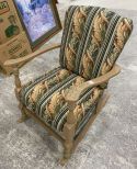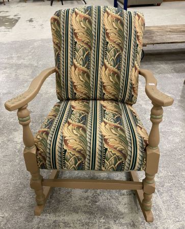 Antique Wood Rocker, restored, painted in creamy beige with soft green accents, new matching fabric with tacks, and embroidered back. Antique Wood Rocker, restored, painted in creamy beige with soft green accents, new matching fabric with tacks, and embroidered back.