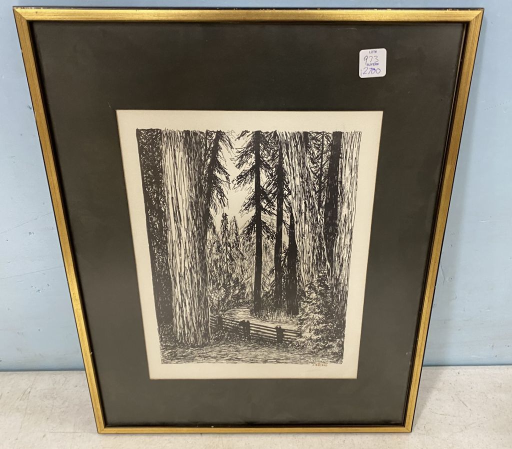 "California Red Wood" Print by J Brians. Artist signed, matted, and framed. 21" h. x 16" w. "California Red Wood" Print by J Brians. Artist signed, matted, and framed. 21" h. x 16" w.