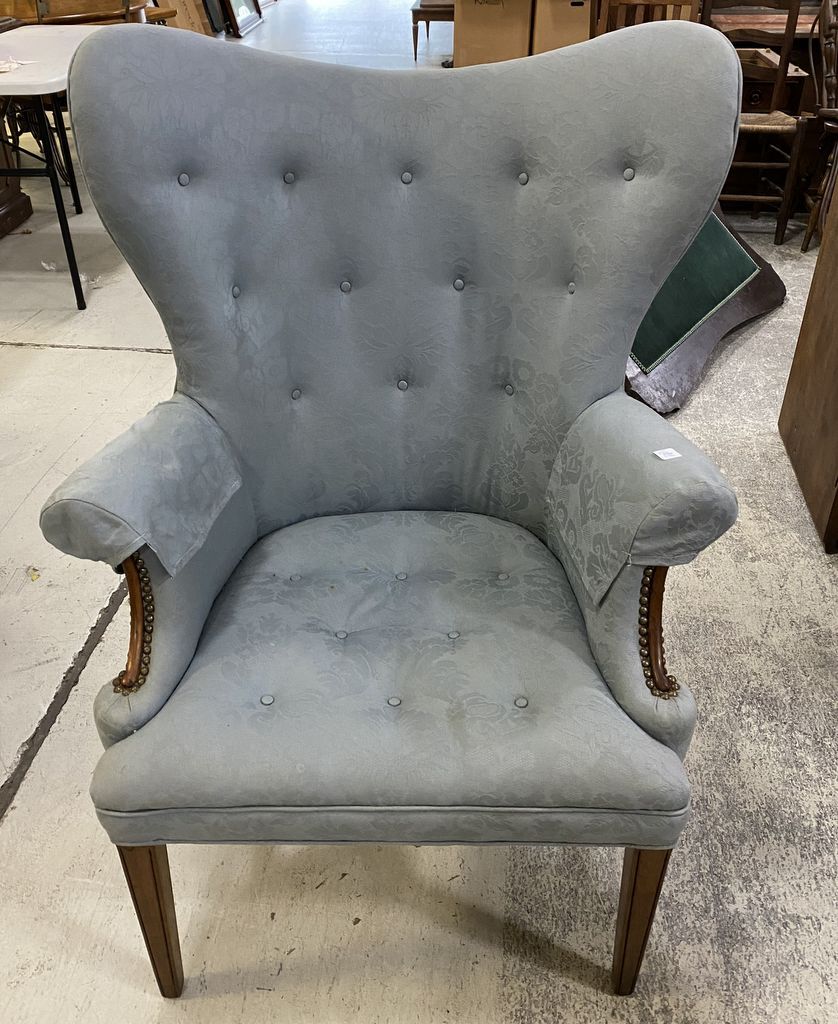 Upholstered French Style Parlor Chair, fabric is dirty. Upholstered French Style Parlor Chair, fabric is dirty.