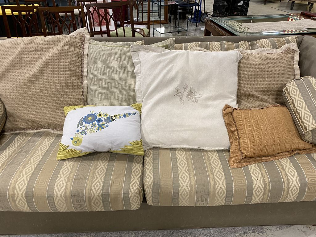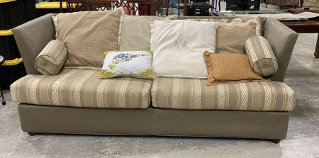 Upholstered Sofa Bed, two cushions, with throw pillows, 7'9. Upholstered Sofa Bed, two cushions, with throw pillows, 7'9.
