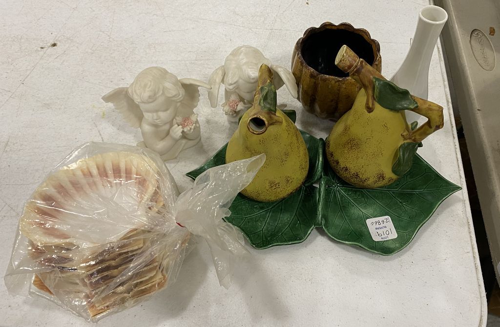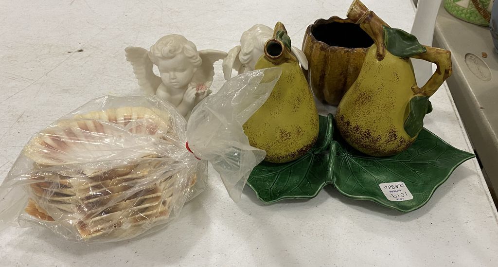 Group of Ceramic Items Including Angels, Set of Queen Scallop Seashell Dishes, and Other Misc Items. Group of Ceramic Items Including Angels, Set of Queen Scallop Seashell Dishes, and Other Misc Items.