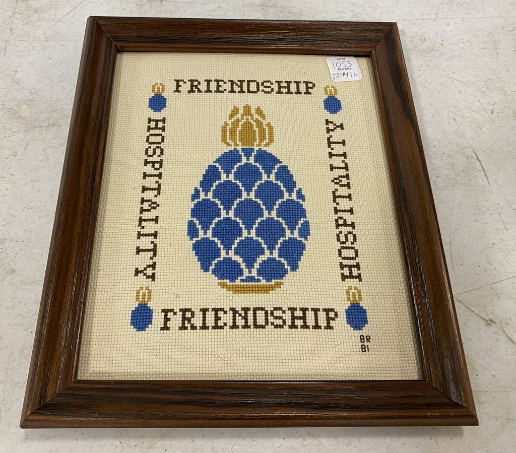 Framed Needlepoint "Friendship". 12" h. 10" w. Framed Needlepoint "Friendship". 12" h. 10" w.