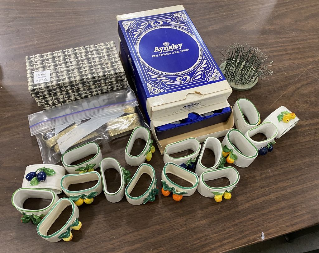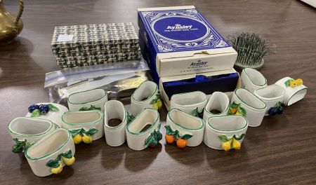 5 Boxes of Name Plate Holders and 2 Sets of Napkin Rings. 2 boxes of Aynsley Fine English Bone China Name Holders. 3 boxes of Genuine Lead Crystal Name Holders. Set of Porcelain with Grapes Napkin Holders and Set of Brass Napkin Holders. 5 Boxes of Name Plate Holders and 2 Sets of Napkin Rings. 2 boxes of Aynsley Fine English Bone China Name Holders. 3 boxes of Genuine Lead Crystal Name Holders. Set of Porcelain with Grapes Napkin Holders and Set of Brass Napkin Holders.