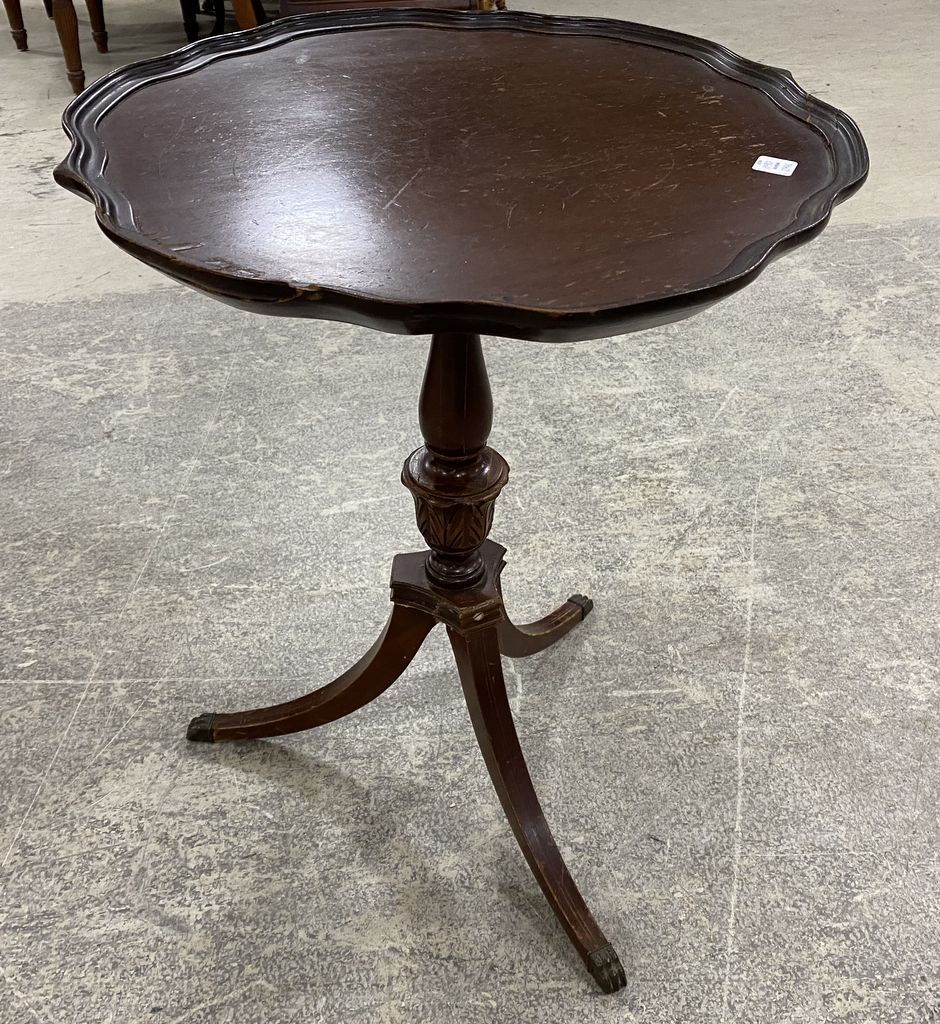 Mahogany Round Pie Crest Table, pedestal stand, has damage, 26"h., 21"dia. Mahogany Round Pie Crest Table, pedestal stand, has damage, 26"h., 21"dia.