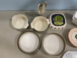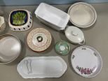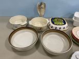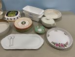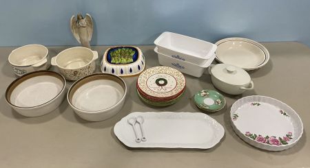 Group of Assorted Dishes. Includes an Angel figurine, 2 loaf pans, 2 temper-ware pans, Christmas plates, Set of 2 Mikasa Potters Art dishes, and other misc items Group of Assorted Dishes. Includes an Angel figurine, 2 loaf pans, 2 temper-ware pans, Christmas plates, Set of 2 Mikasa Potters Art dishes, and other misc items