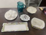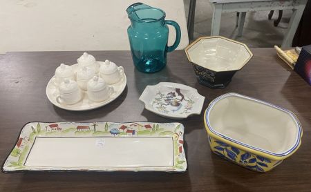 Group of Assorted Pottery, Set of 6 Pot De Creme, Large Hand Painted Tray, and Other Misc Items. Group of Assorted Pottery, Set of 6 Pot De Creme, Large Hand Painted Tray, and Other Misc Items.