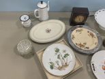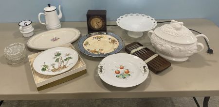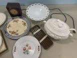 Assorted Grouping of Glassware and Other Misc Items. Includes clock, 3 plates, 1 platter, ashtrays, soup tureen, set of knifes in holder, and other misc items. Assorted Grouping of Glassware and Other Misc Items. Includes clock, 3 plates, 1 platter, ashtrays, soup tureen, set of knifes in holder, and other misc items.