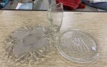 Pressed Glass Center Piece, Christmas Charger 13"dia., and Etched Glass Pitcher Pressed Glass Center Piece, Christmas Charger 13"dia., and Etched Glass Pitcher