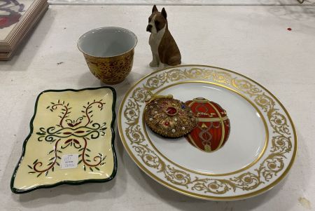 1131 Porcelain Charger, Dog Figurine, Gold Gilt Bowl, and Tray