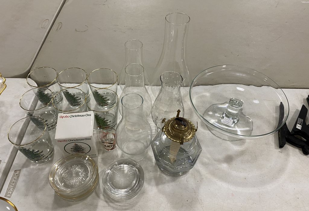 1147 Group of Lantern Shades, Christmas Cups, Glass Cake Stand, and Set of Coasters