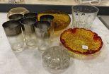 Silver plate rimmed glasses, bubble glass bowl, ash tray, frogger, vase. Silver plate rimmed glasses, bubble glass bowl, ash tray, frogger, vase.