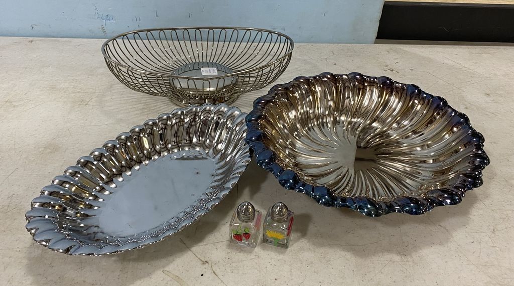 Group of Silver Plate Pieces, bowls, wire basket, salt & Pepper. Group of Silver Plate Pieces, bowls, wire basket, salt & Pepper.