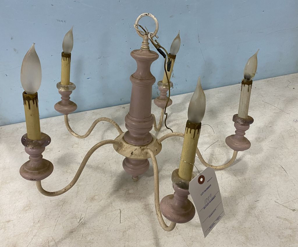 Five Arm Light Fixture, pink painted, used condition, 21"w. Five Arm Light Fixture, pink painted, used condition, 21"w.