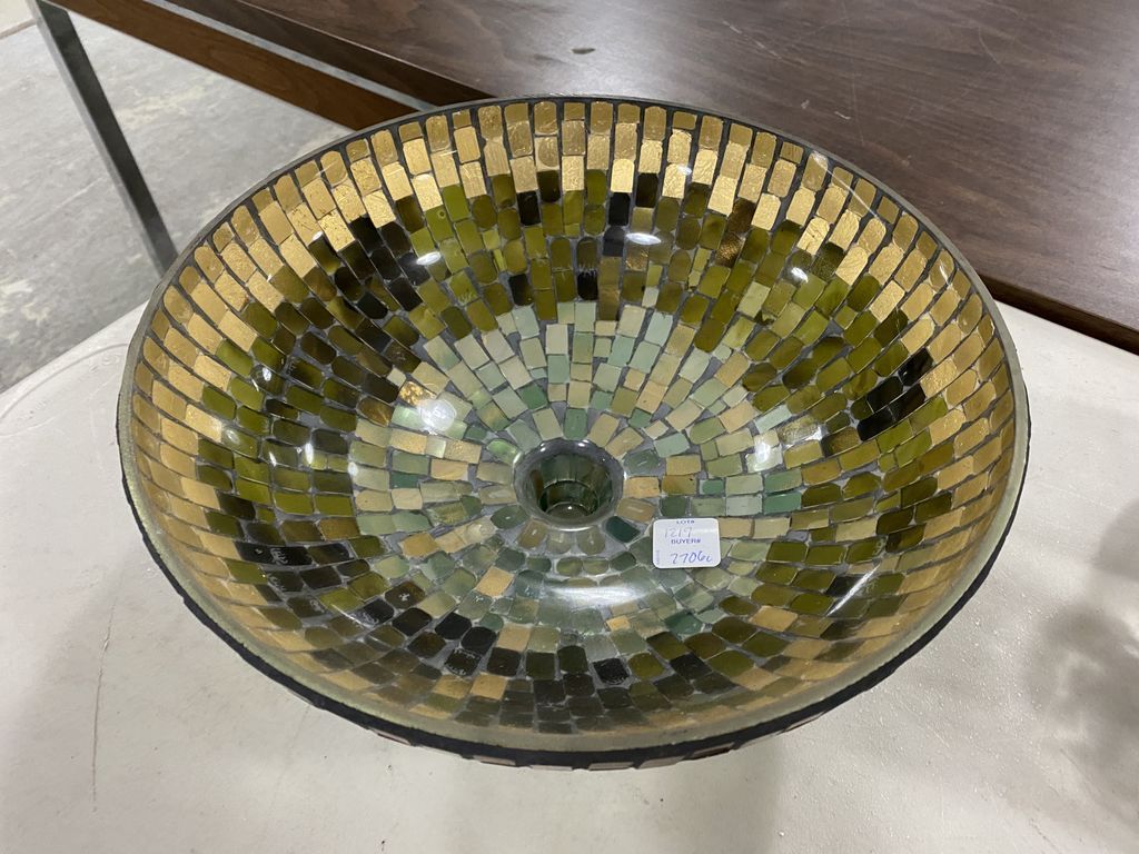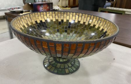 Decorative Mosaic compote, glass multi color, 6"h., 12"dia. Decorative Mosaic compote, glass multi color, 6"h., 12"dia.