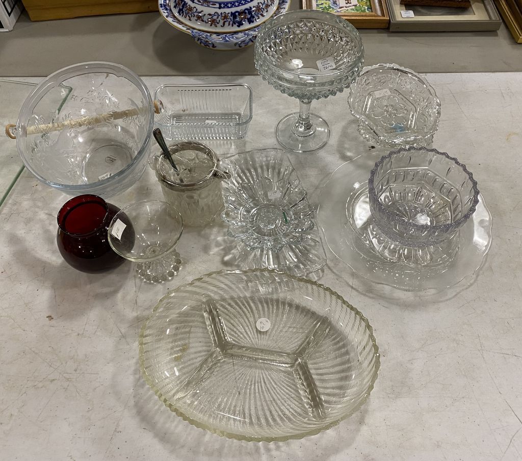 Group of Glassware. Divided dish, compote, red vase, press glass bowl, fruit bowl with handle, glass plate, and etc. Group of Glassware. Divided dish, compote, red vase, press glass bowl, fruit bowl with handle, glass plate, and etc.