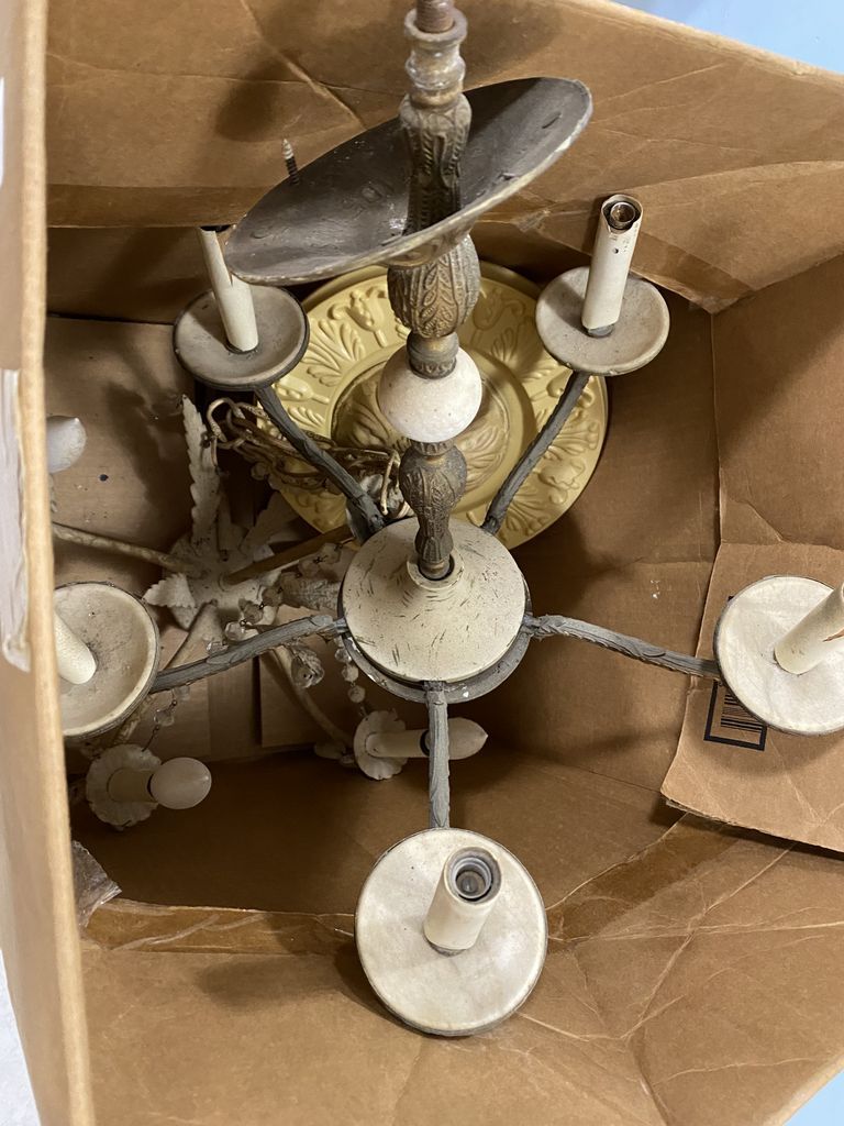 Two Vintage Light Fixtures, five arm lighted, painted, used condition. Two Vintage Light Fixtures, five arm lighted, painted, used condition.