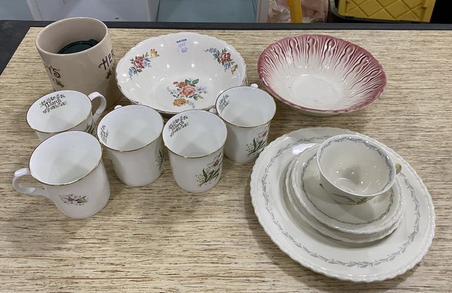 Assorted Collection of Porcelain Bowls, Plates, and Cup, March Mugs, bowls, one has chip, place setting china. Assorted Collection of Porcelain Bowls, Plates, and Cup, March Mugs, bowls, one has chip, place setting china.