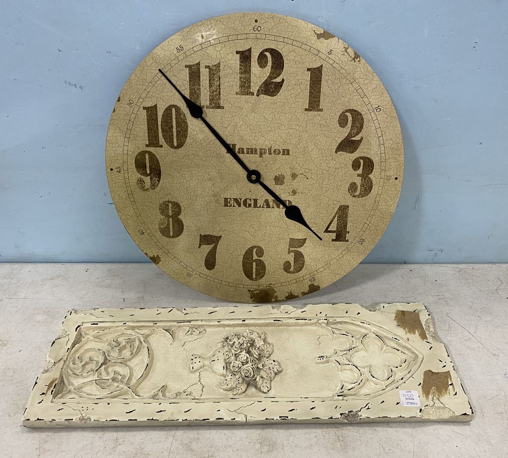 Hampton England Battery Wall Clock and Resin White Wall Plaque 23"w. Hampton England Battery Wall Clock and Resin White Wall Plaque 23"w.