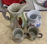 Ceramic Greyhound handle pitcher, ceramic hand painted pitcher, two stoneware mugs. Ceramic Greyhound handle pitcher, ceramic hand painted pitcher, two stoneware mugs.