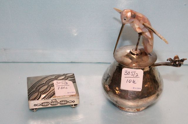 305 Small Box Signed E. Bilagody, Mexican Silver Condiment with Spoon & Mother of Hummingbird Box