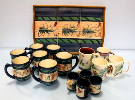 537 Painted Tile Tray, Eleven Gail Pittman Mugs, Four Demi Cups