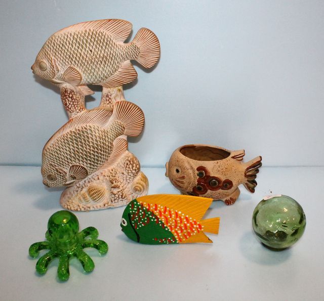 734 Small Painted Fish Bowl, Fish and Coral Pottery, Hand painted Fish, Plastic Octopus & Glass Ball
