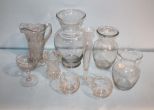 753 Three Clear Vases, Etched Bud Vase, Pressed Glass Pitcher, Small Vase, Etched Stem & Two Etched Creamers