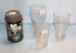 783 Two Coke Glasses, Flinstone Glass & Fruit Jar of Buttons